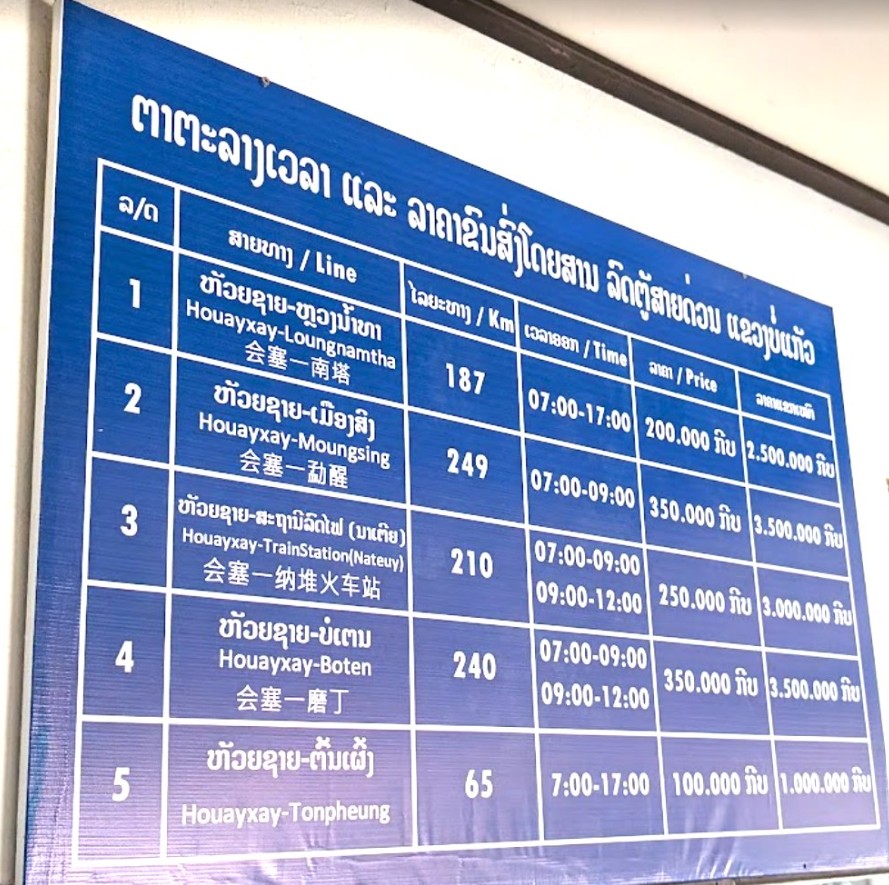 The former Keo Champa bus station is now being used for local Bokeo Province destinations. The prices and departure times as of March 2023 are shown in the picture below: