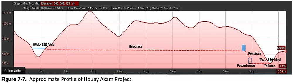 The layout of the project is seen in profile image below with a 7.5 km headrace conduit, a surge tower, penstock, powerhouse and tailrace.