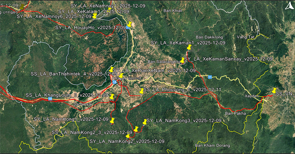 All three Nam Kong Hydropower project site locations are shown in the satellite image below with Nam Kong 2 powerhouse at coordinates - 14°29'52.6"N 106°49'15.5"E (14.497944, 106.820972) .