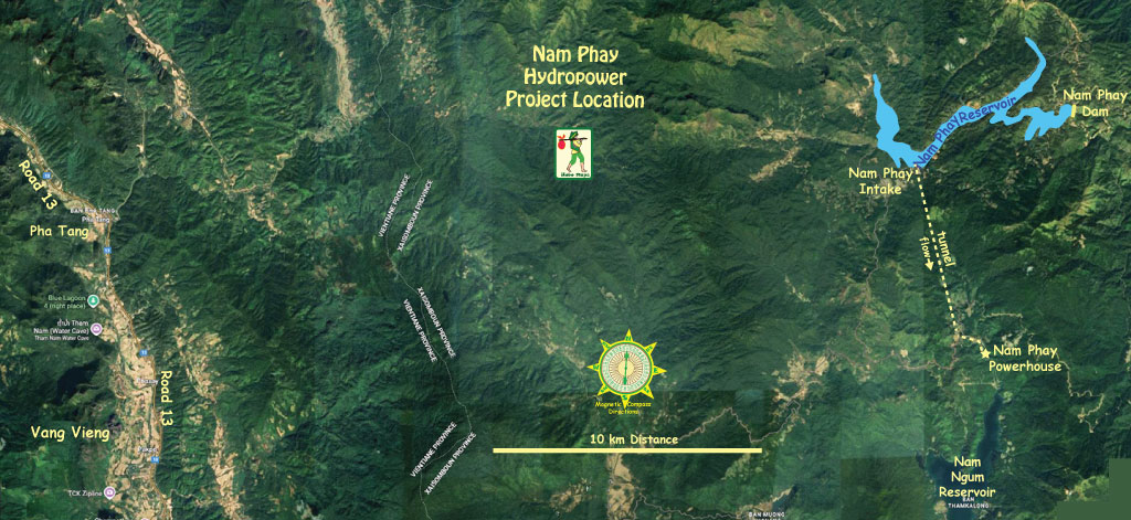 Nam Phay hydropower project layout image below. The powerhouse is about 6.5 km south of the reservoir intake structure and we are assuming there must be an underground conduit connecting them although we haven't seen any info confirming this. The powerhouse has been confirmed as being on the right bank of the Nam Leuk (Louk) river south of the reservoir.