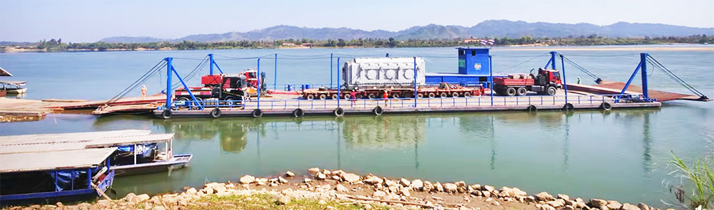 Massive size and 236 tons weight of 500 kV transformer for Nam Theun 1 required special transport of 1,100 km from Thailand to Laos across the Mekong as seen in images below: